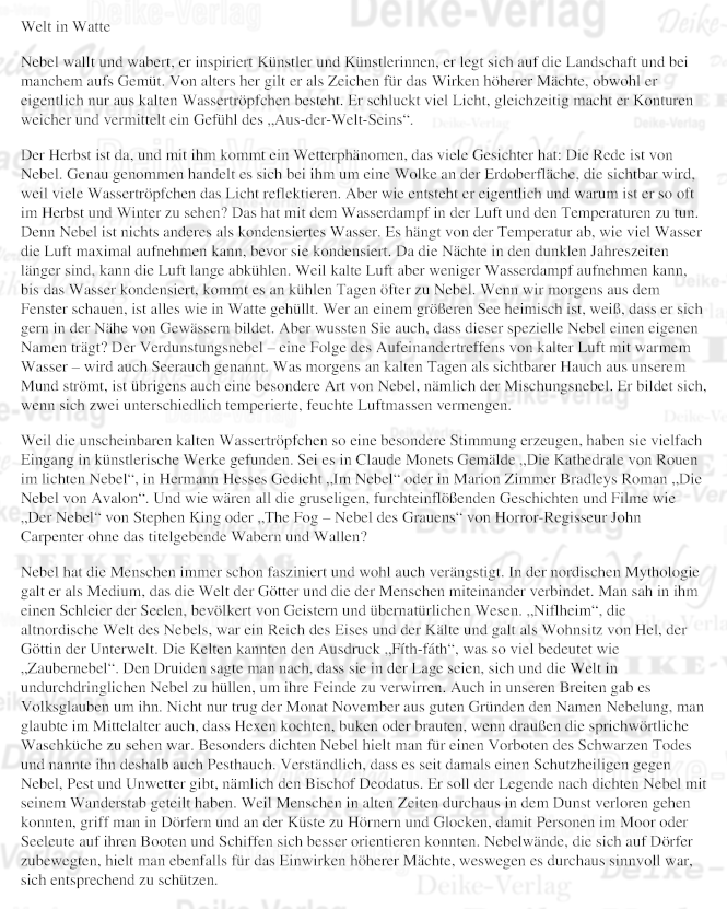 Nebel wallt und wabert, er inspiriert Künstler und Künstlerinnen, er legt sich auf die Landschaft und bei manchem aufs Gemüt. Von alters her gilt er als Zeichen für das Wirken höherer Mächte, obwohl er eigentlich nur aus kalten Wassertröpfchen besteht.