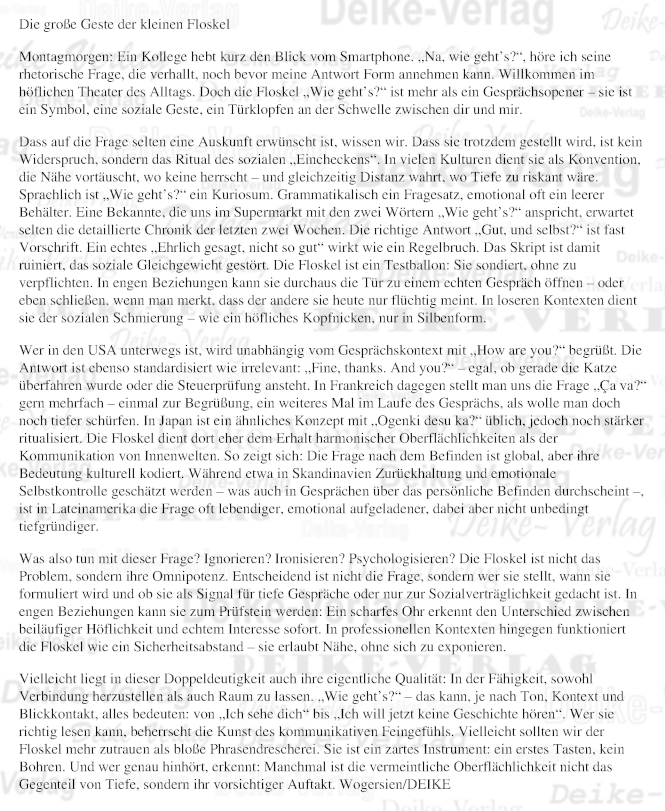 Montagmorgen: Ein Kollege hebt kurz den Blick vom Smartphone. „Na, wie geht’s?“, höre ich seine rhetorische Frage, die verhallt, noch bevor meine Antwort Form annehmen kann. Willkommen im höflichen Theater des Alltags. Doch die Floskel „Wie geht’s?“ ist mehr als ein Gesprächsopener – sie ist ein Symbol, eine soziale Geste, ein Türklopfen an der Schwelle zwischen dir und mir.